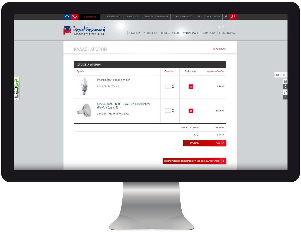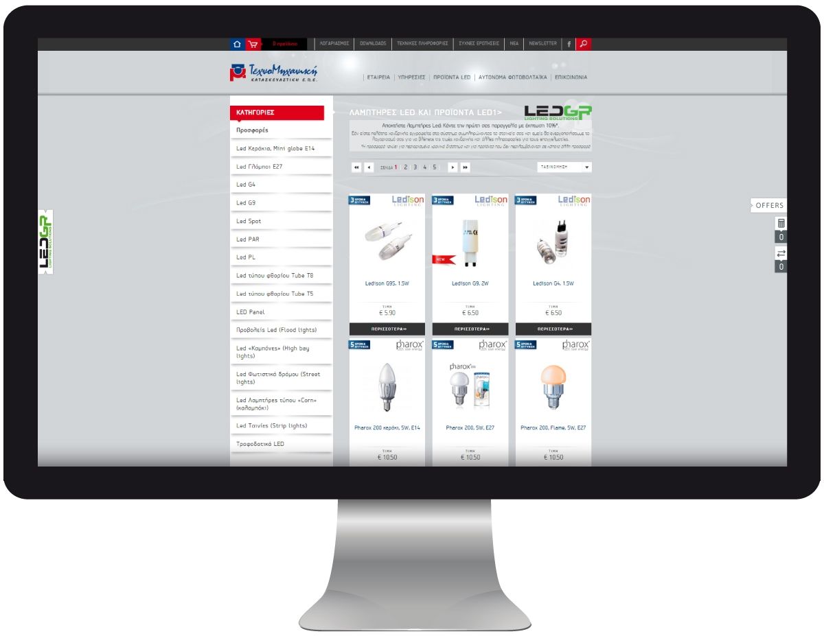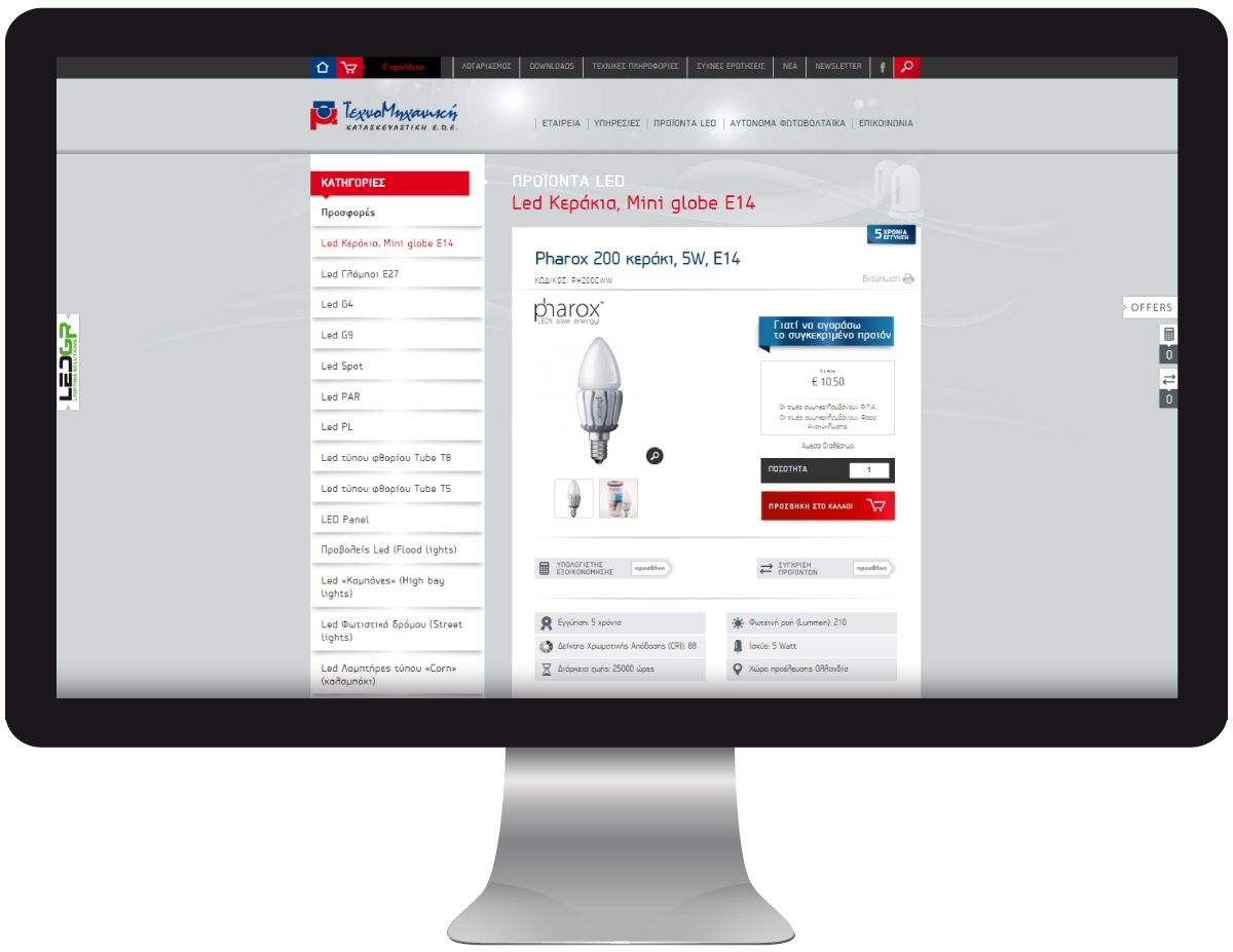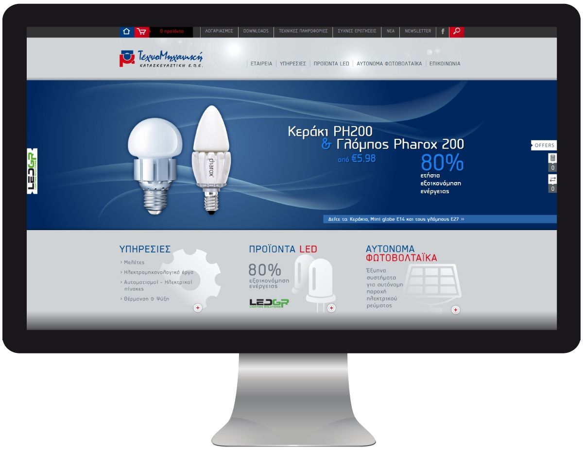 Η εταιρεία μας σχεδίασε και κατασκεύασε το ηλεκτρονικό κατάστημα της εταιρείας μέσω του οποίου προβάλλονται κυρίως προϊόντα τεχνολογίας LED. Οι επισκέπτες της ιστοσελίδας έχουν τη δυνατότητα να αναζητήσουν εύκολα τα προϊόντα που τους ενδιαφέρουν, ενώ παράλληλα έχουν τη δυνατότητα να υπολογίσουν την εξοικονόμηση ενέργειας με χρήση λαμπτήρων LED χάριν στον υπολογιστή εξοικονόμησης που δημιουργήσαμε.